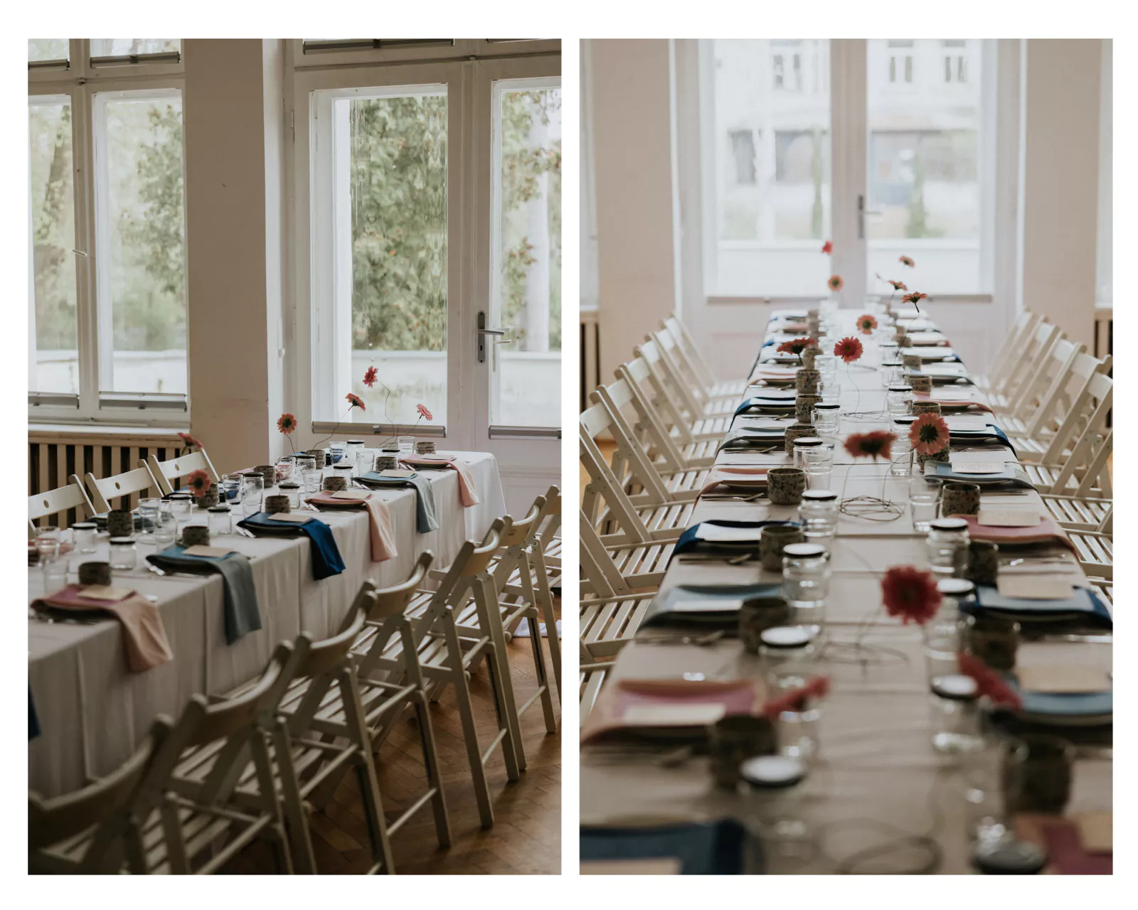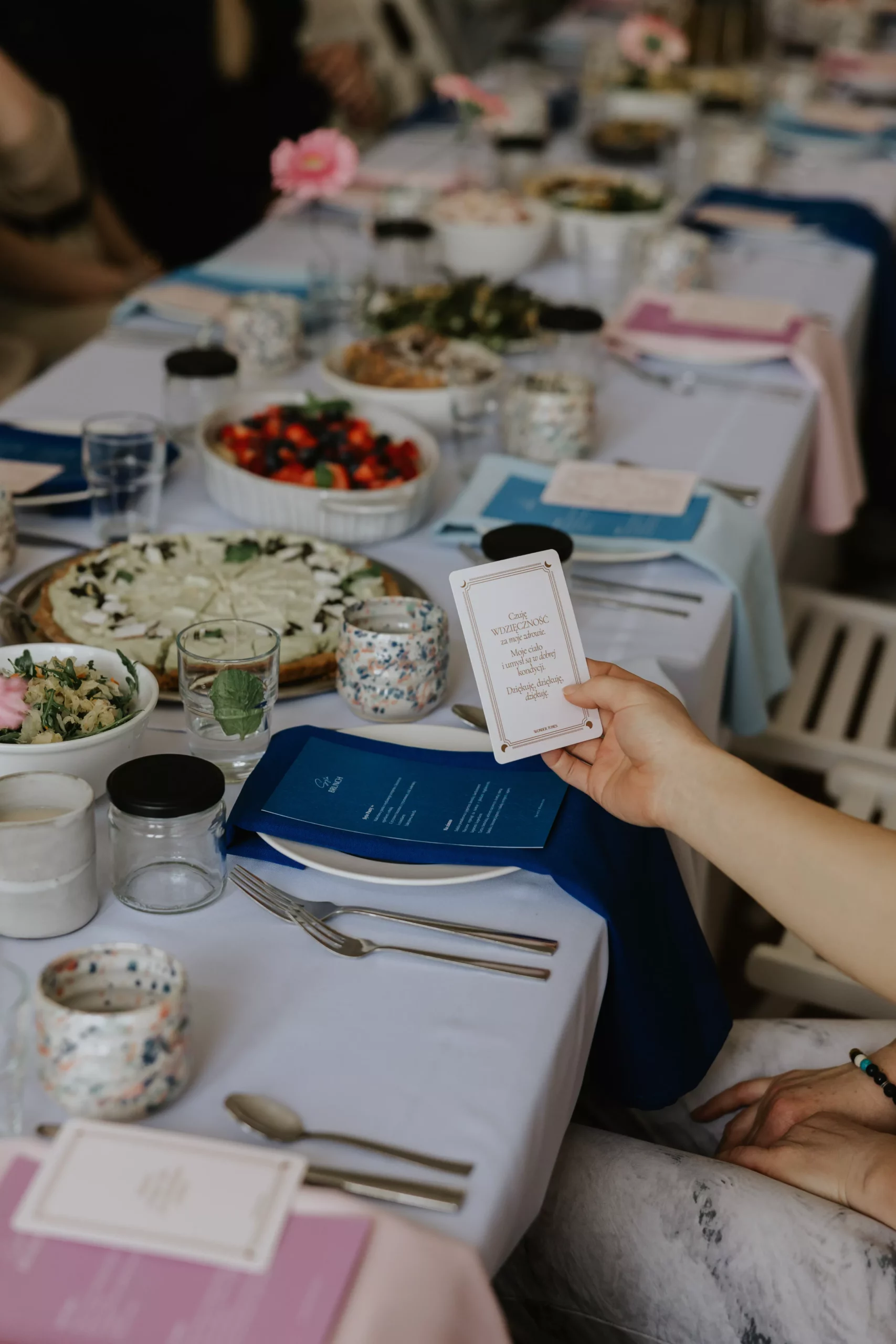 Za wielkimi, starymi, drewnianymi drzwiami stał długi nakryty białym obrusem stół. W anturażu białych ścian i drewnianych okiennic, trudno było nakryć go czymś innym, kolorowym. To musiało zostać takie czyste i proste. Dla kontrastu i wyrazu naszych trzech osobowości wybrałam trzy kolory serwet, a do pary drukowane w tym samym kolorze menu. Powodem wyboru konkretnych kolorów, czyli granat, błękitny i jasny róż, były kolory występujące na kubkach, które stanęły na stole, a wykonała je Natalia. Na górze menu każda z uczestniczek otrzymała kartę z afirmacją od Magdy, która mogła posłużyć jako wskazówka do codziennego życia.