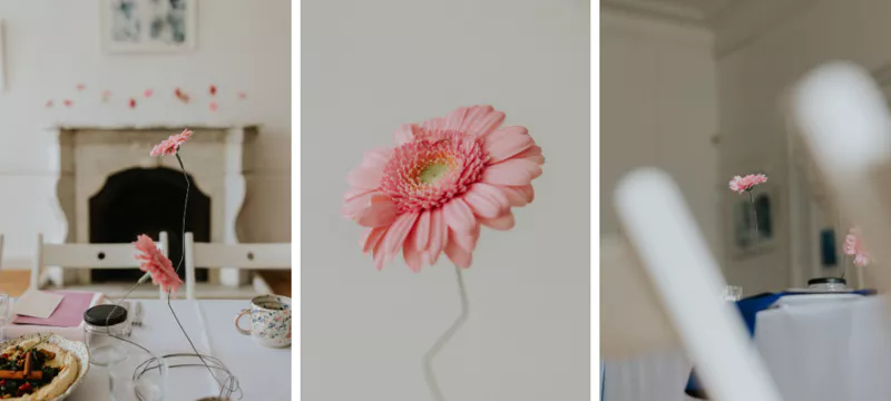 Podczas tego wydarzenia postanowiłam stworzyć coś samodzielnie. Od początku KREATYWNOŚĆ była motyw przewodnim tego spotkania, więc zamiast klasycznych wazonów stworzyłam druciane podstawki na różowe gerbery. Trochę obawiałam się tego efektu, ale nie było czego. Wyszło bajecznie i w punkt. Lekkie, delikatne i hipnotyzująco piękne, jak wiosna. Takie właśnie były te małe, kwiatowe instalacje.