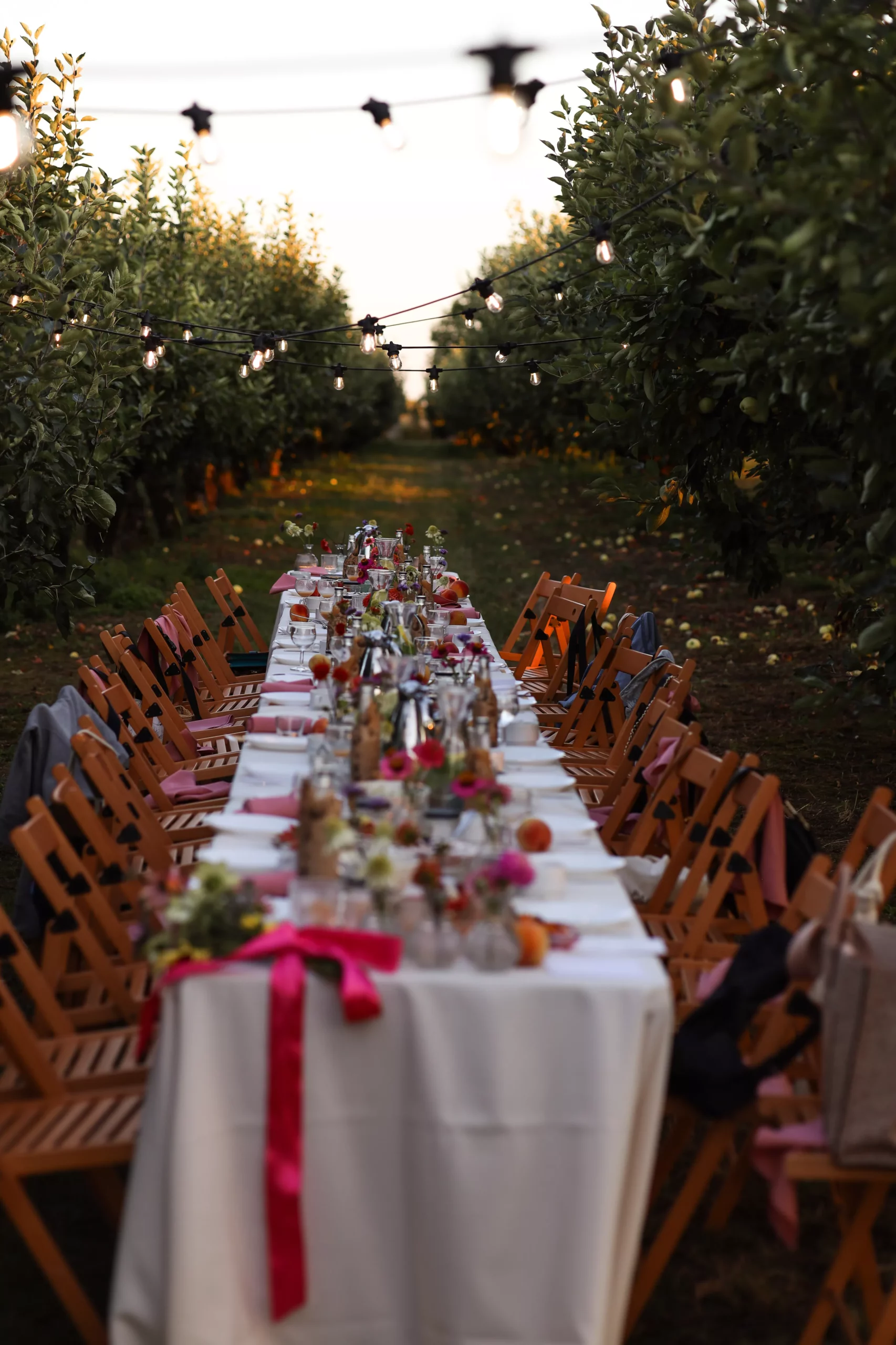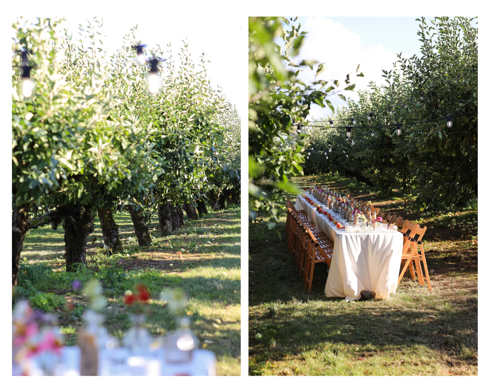 Tłem dla serwet i menu były kryształowe talerze oraz proste, klasyczne kieliszki i filiżanki. Od samego początku zależało mi na tym, aby to natura grała pierwsze skrzypce. By żaden element nie odciągął wzroku od tych pięknych jabłonek, szczególnie, że zasiedliśmy do stołu pośród wiekowych papierówek.