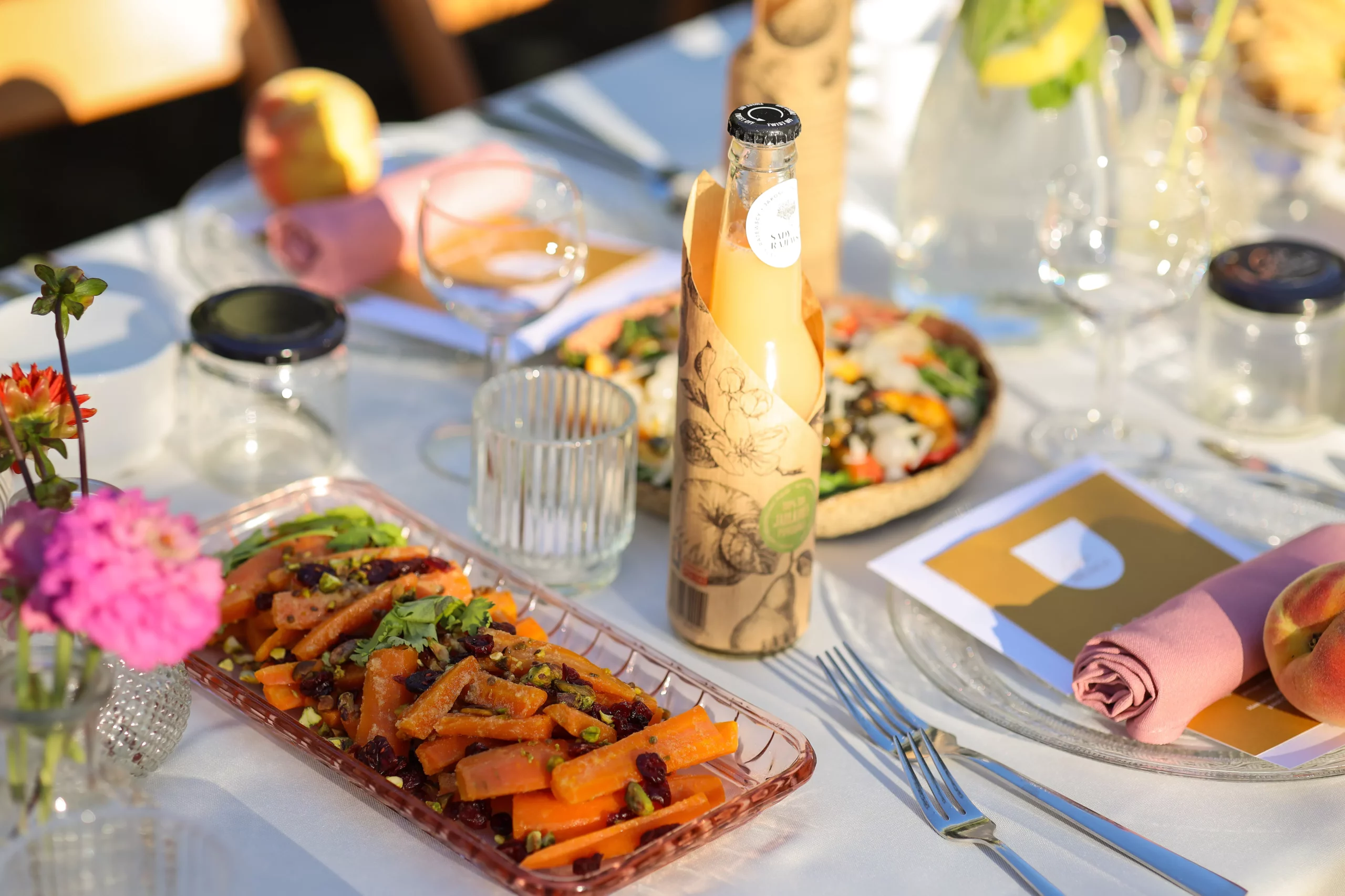 Na stole pojawiły się jasno beżowe obrusy, które były niczym czyste płótne, na którym namalowałam ten letni obraz. Zwinięte różowe serwety pięknie kontrastowały na złotych okładkach menu przy akompaniamencie świeżo zerwanych z sadu brzoskwiń. Efekt ? Oszałamiający.