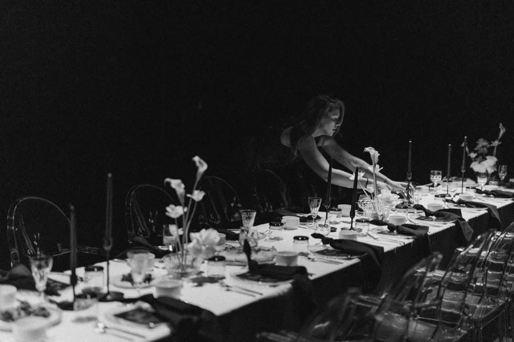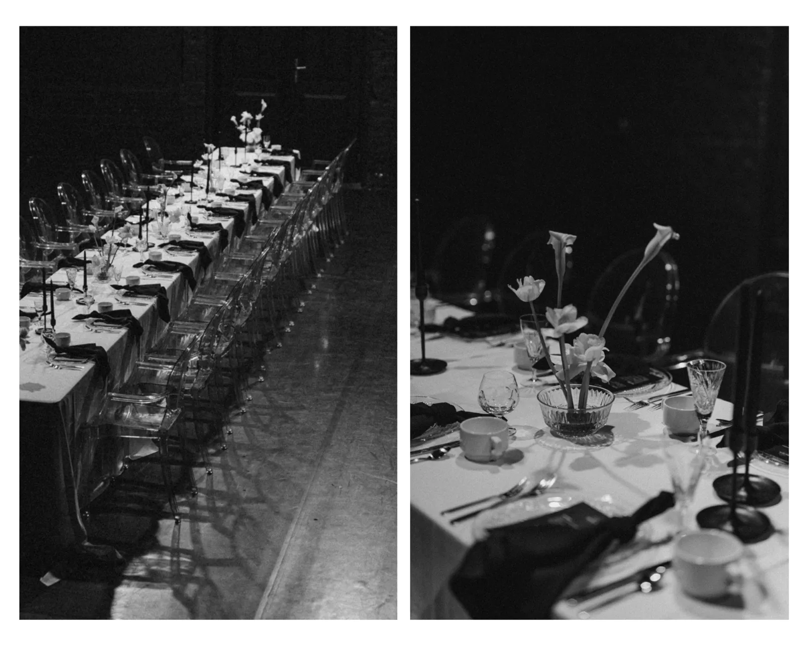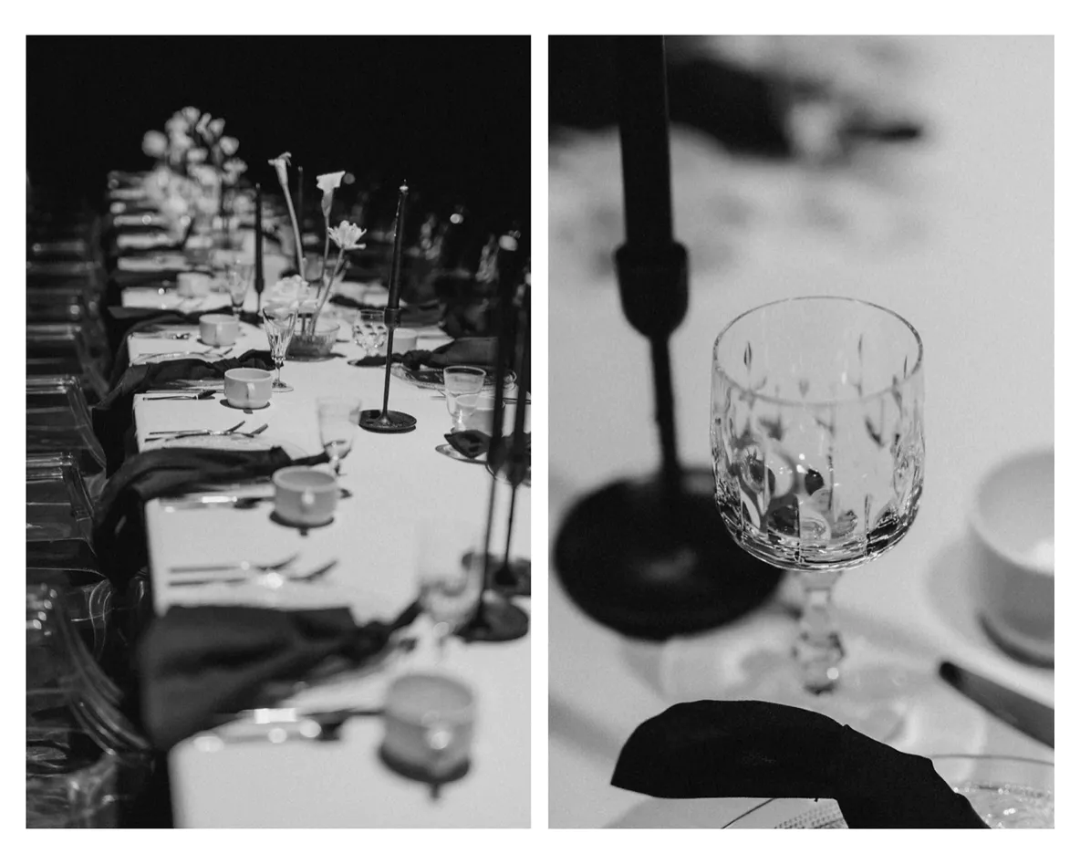 Tym razem postawiłam na monochromatyczne, klasyczne połączenie czerni i bieli. Oczywistym wyborem był biały obrus i czarne serwety. Do tego czarne wydruki menu przepięknie prezentowały się na kryształowych talerzach od Manimali. Pomiędzy talerzami ustawiłam czarne świeczniki i świece, które nadały jeszcze bardziej eleganckiego klimatu.