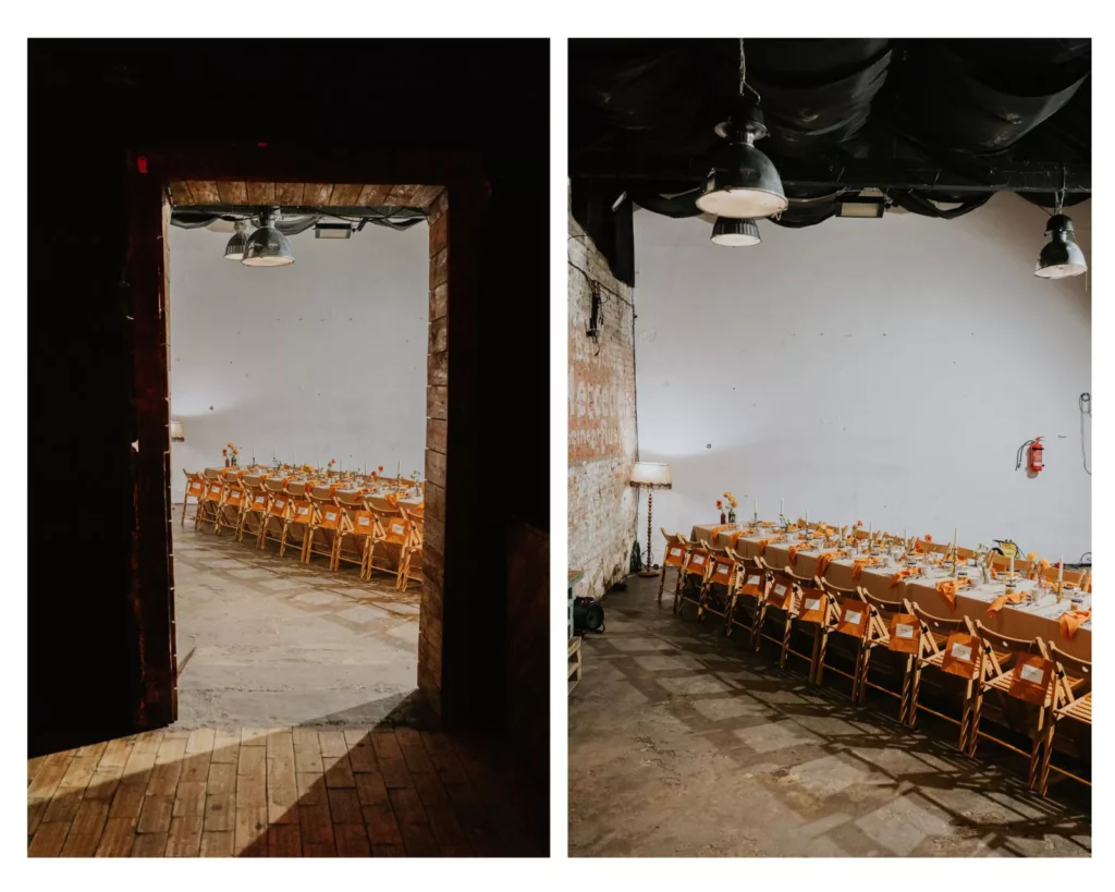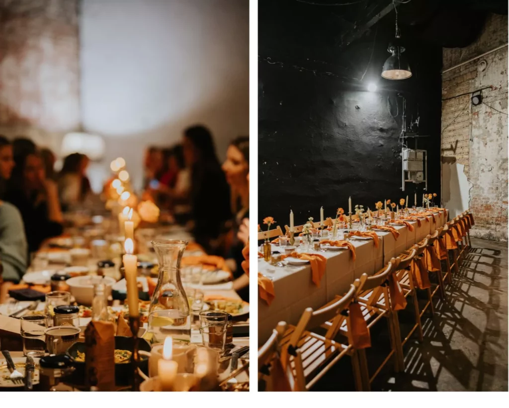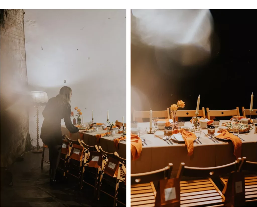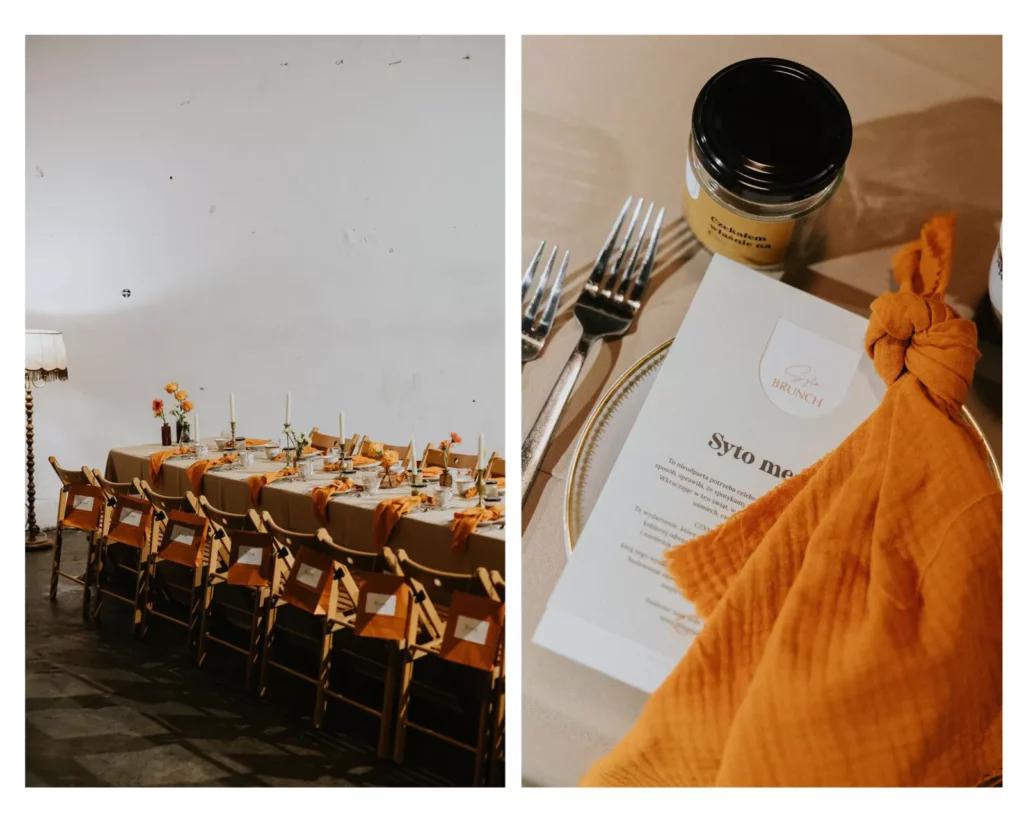Na stole znalazły się piaskowe obrusy, pomarańczowe muślinowe serwety oraz klasyczne ecru menu. Pomimo domowej atmosfery, na której najbardziej nam zależało, chciałyśmy również, aby każda z gościn zasiadła do eleganckiego stołu, dlatego wybrałyśmy białe talerze ze złotymi akcentami i pasujące do nich filiżanki od Propsy Home. Każde inne, ciekawe, różne tak, jak nasze uczestniczki.