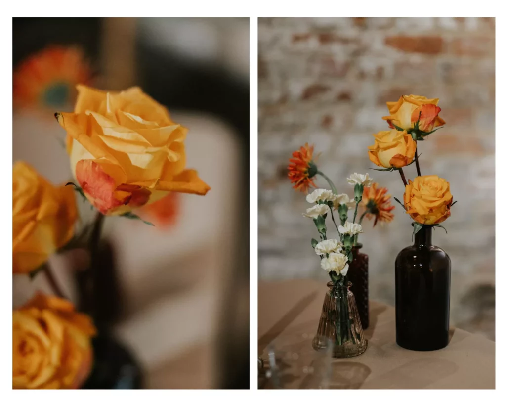 Obok talerzy zawsze stoją kwiaty, które uwielbiam i nie ukrywam, że to jeden z moich ulubionych momentów podczas przygotowań każdego spotkania. Na tę okazję wybrałam żółto pomarańczowe róże, poszarpane pomarańczowe gerbery i kremowe goździki. Wszystko ułożone w najróżniejsze wazoniki w odcieniach brązu i pomarańczu od Manimali, a obok nich pięknie prezentowały się mosiężne świeczniki, które podczas spotkania nadały kameralnej i przytulnej atmosfery.