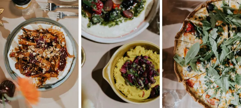 Ania przygotowała dwie tarty: jedną z pieczoną dynią, szpinakiem, suszonymi pomidorami i fetą oraz tartę z grillowanymi warzywami, wegańskim serem i rukolą. Z mojej strony można było zjeść pastę z pieczonej dyni z fetą i gruszką, ulubioną pieczoną marchewkę na jogurcie tahini z żurawiną i migdałami czy caponatę z czerwonej kapusty z rodzynkami, orzechami włoskimi i szpinakiem.